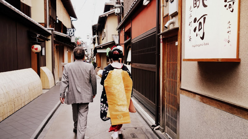 轉進一條小巷子,看見前面走著一位大叔和一個藝妓。
