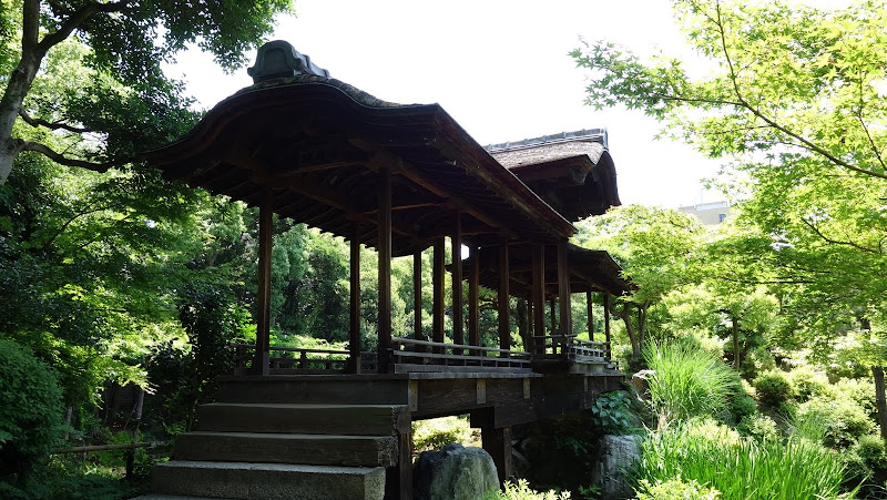 京都 涉成園為迴游式庭園,以印月池為主,環繞著書院(閔風亭、滴翠軒、傍花閣、臨池亭),茶室(漱枕居、縮遠亭、蘆菴、代笠席),佛堂(園林堂)和其他聯絡建物的回棹廊、侵雪橋等等。
