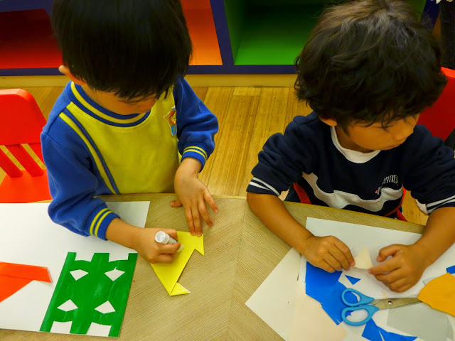 小朋友們把剪好的色紙貼在紙上。