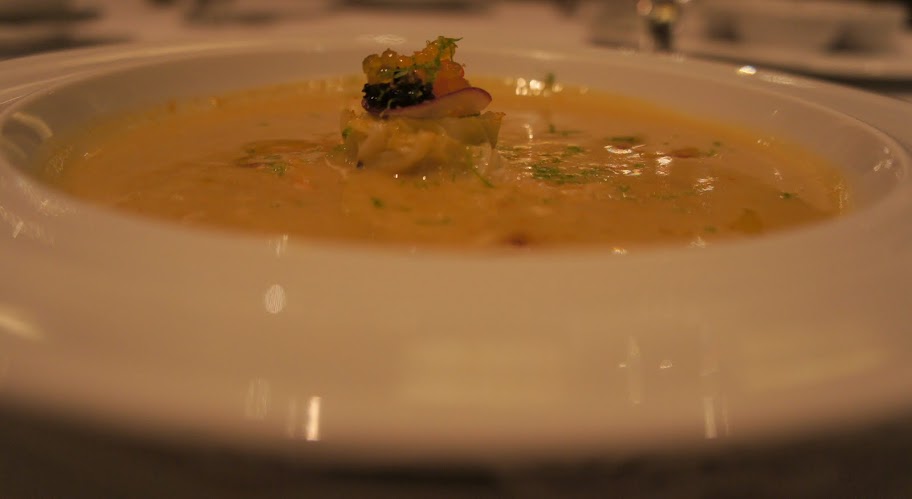 蟹腳肉、皺葉甘藍、明太子、番紅花濃湯, 食材本身都不錯,但這些食材的味道搭配得不太協調。(2顆星)