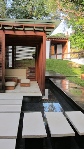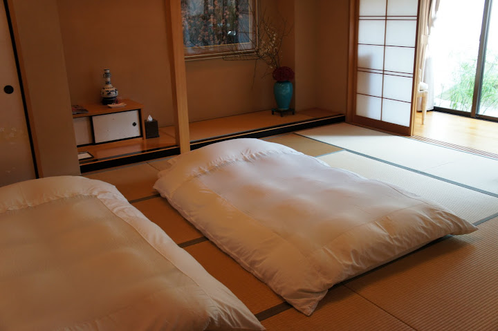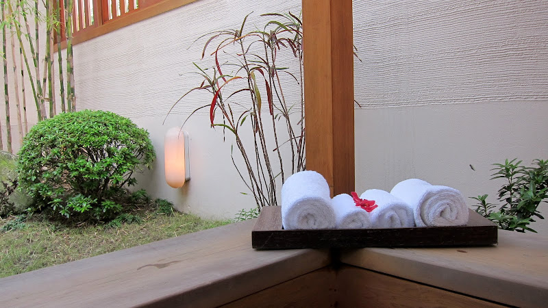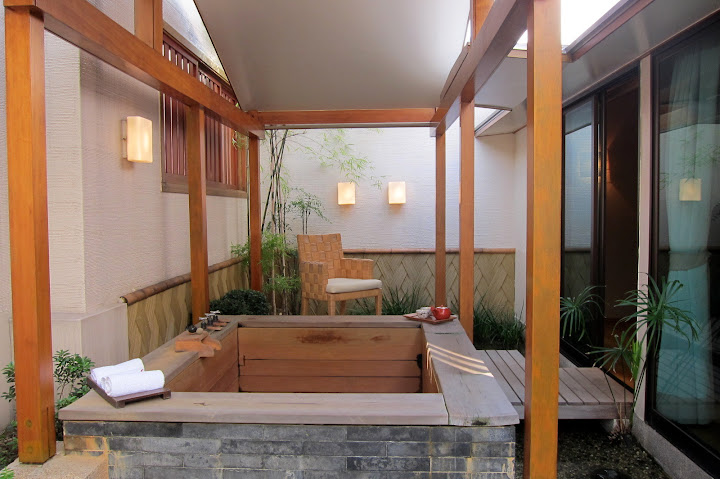 非常日式的設計,灑滿陽光的走廊,落地窗外就是庭院和湯池。