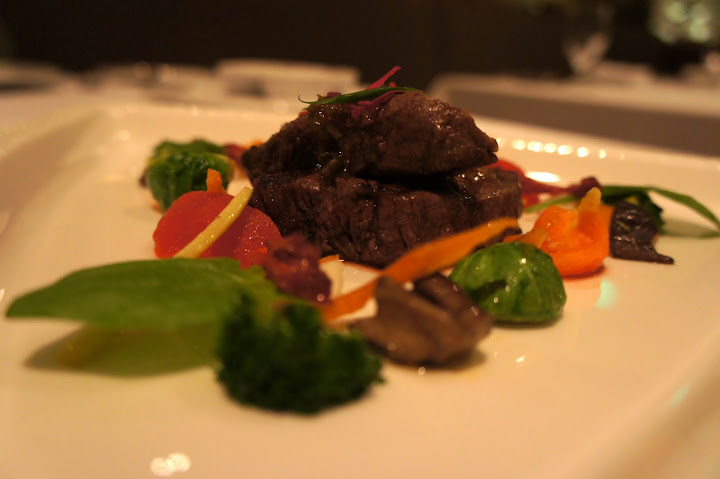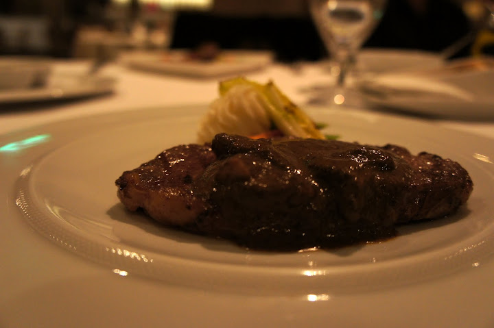 主菜: 碳烤菲力、綠胡椒醬。這道是我點的主菜。服務人員說這道醬汁的部分是以香氛手法呈現,我不是很懂 > <。主菜只能說是尚可,沒有讓我的味蕾很感動。(3.6顆星)