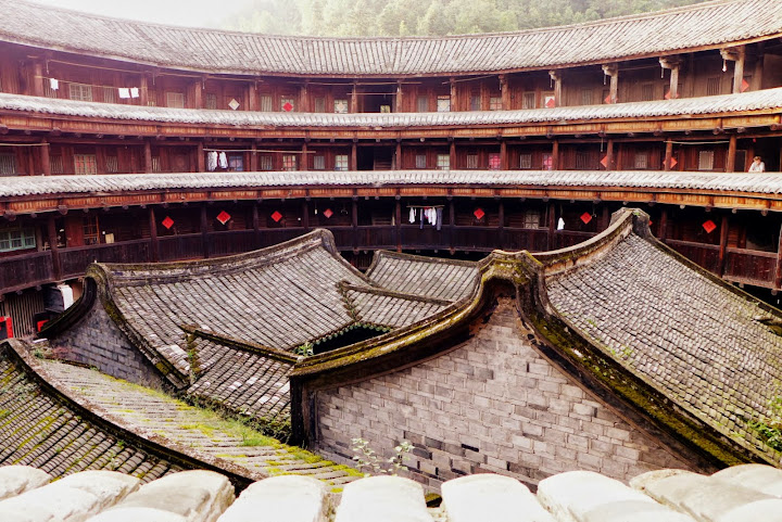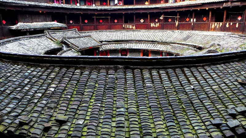 如果不住這裡,很多人是選擇到塔下村那邊去住民宿。參觀的幾個土樓群中,我還是最喜歡安靜的南溪土樓群。這裡沒有喧鬧的攤位和團體的觀光客,我最愛的那些罩著綠色薄霧的屋瓦和石牆,最適合這樣的寧靜。:)