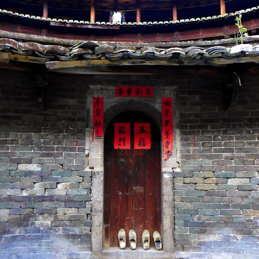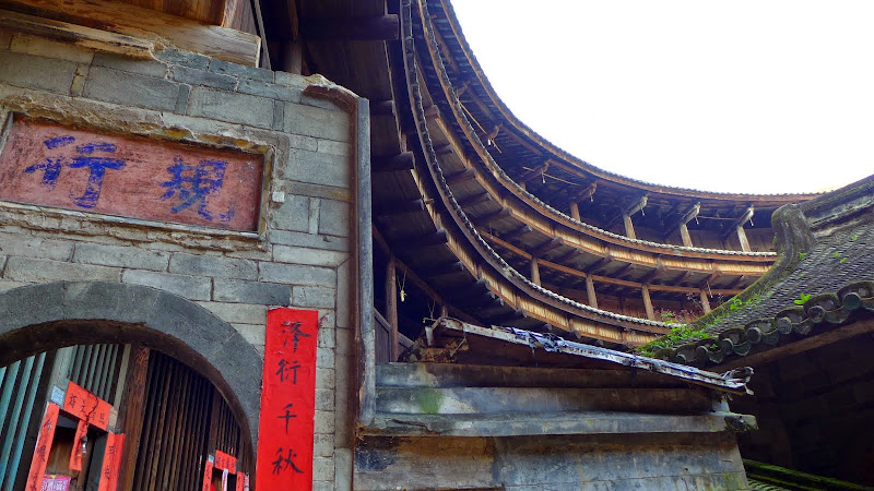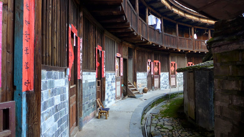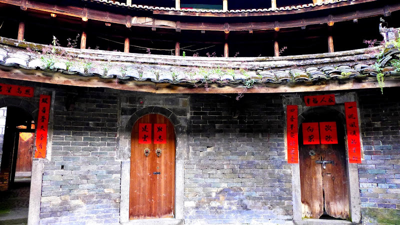 每一家都貼著紅色的對聯。土樓的每家每戶都是從一樓到四樓的。一樓二樓通常沒有開窗,是為了防盜防搶。三樓四樓才有窗戶。房間內是沒有樓梯的,樓梯都是共用的,通常在土樓幾個的角落。