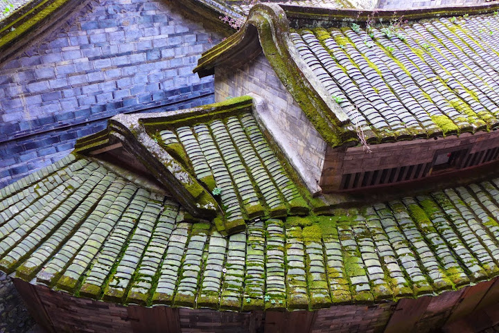 排列整齊的屋瓦中間是綠色的青苔,很漂亮。