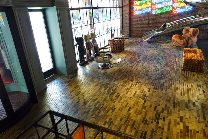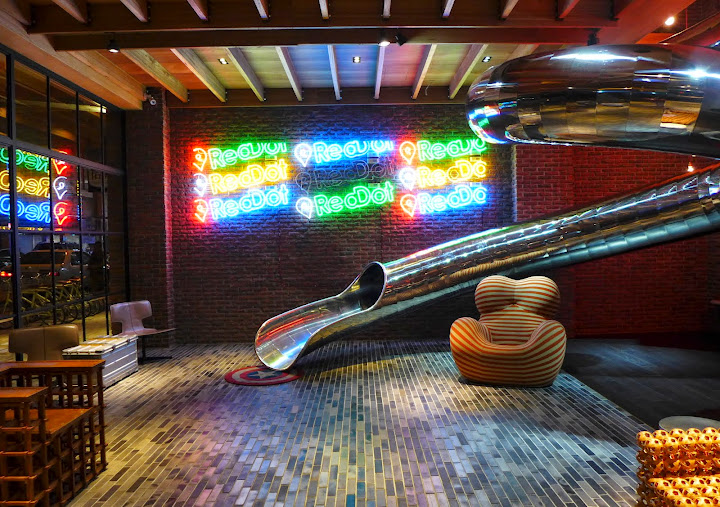 大家對紅點文旅的第一個印象,就是這個金屬打造的大迴旋溜滑梯,從大廳的二樓延伸到一樓。紅點文旅的地點也十分方便,鄰近中華路夜市,到台中車站也只有5分鐘車程。