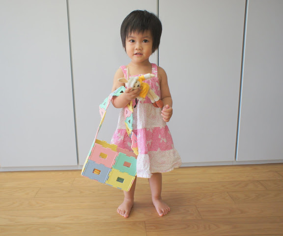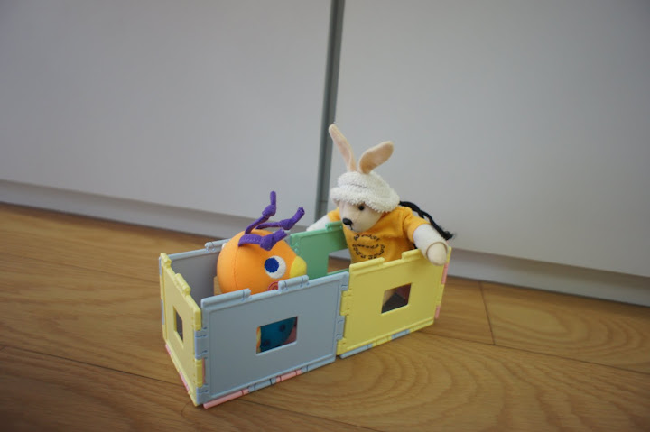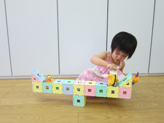 拼了一個蹺蹺板給她的玩偶坐,結果她一直試圖想要自己坐上去 XD