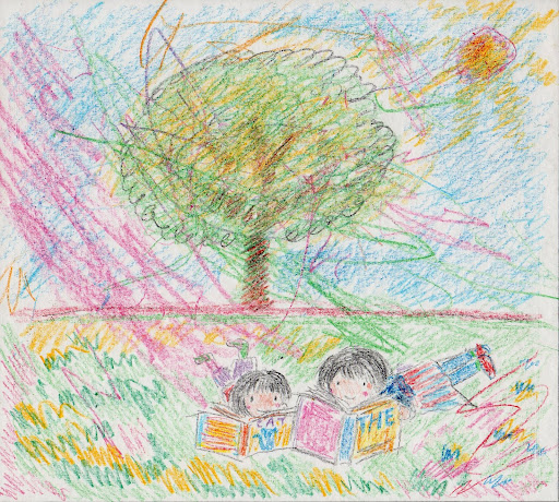 而她的筆觸在畫裡,竟然有意想不到的加分效果啊,的確為畫作增添了一些不一樣的Artistic Touch呢 。:P 像是第二張大樹下的時光,如果沒有了她凌亂充滿抽象風格的筆觸,這畫就變得太平凡了XD。小寶貝幫我的畫,加上了粉紅色的柔柔微風,還有大樹葉子上的金黃耀眼陽光呦! : D