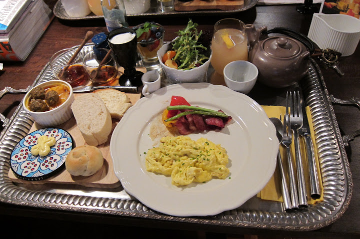 房間裡用的早餐。因為跟網路上看到的有點落差所以有一點點失望。不知道上面是不是就是傳說中四片兩百元的白麵包 XD,可是老公只吃了一塊,然後說麵包不太好吃,就出門開會了 XD。 雖然早餐不甚好吃,但整個早上,房間裡充滿了樓下餐廳傳上來的食物香氣,也可以算是讓人感到幸福的事情之一吧。:P