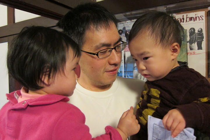 justin叔叔有練過臂力喔! 一手抱一個。