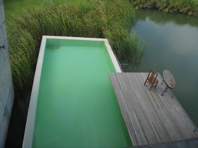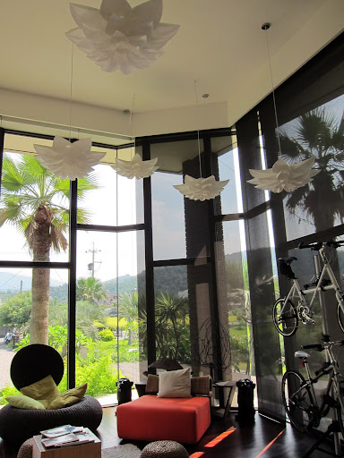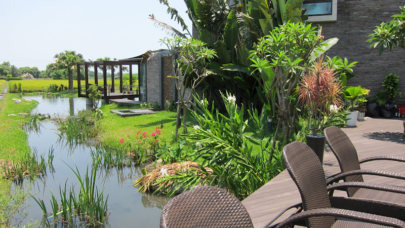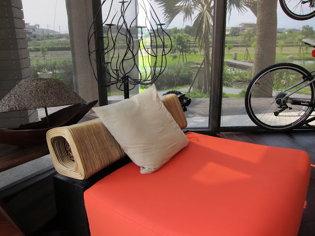 是看到漂亮的玻璃屋的照片被吸引過去的。住在頂樓的玻璃屋,的確會很熱,要開著強力的空調,感覺對北極熊不太友善 > <。還好我預知了玻璃屋遮光一定不會很好,自備了眼罩,所以就很好睡囉。:) 窗外就是七月的蘭陽平原,鋪著閃閃發光的金黃色地毯,是最好的裝飾。配早餐的風景是窗外金黃色的稻田,排排站應該也在吃早餐的白鷺鷥,水池裡的睡蓮,以及在睡蓮葉上跳來跳去的活潑水鳥。
