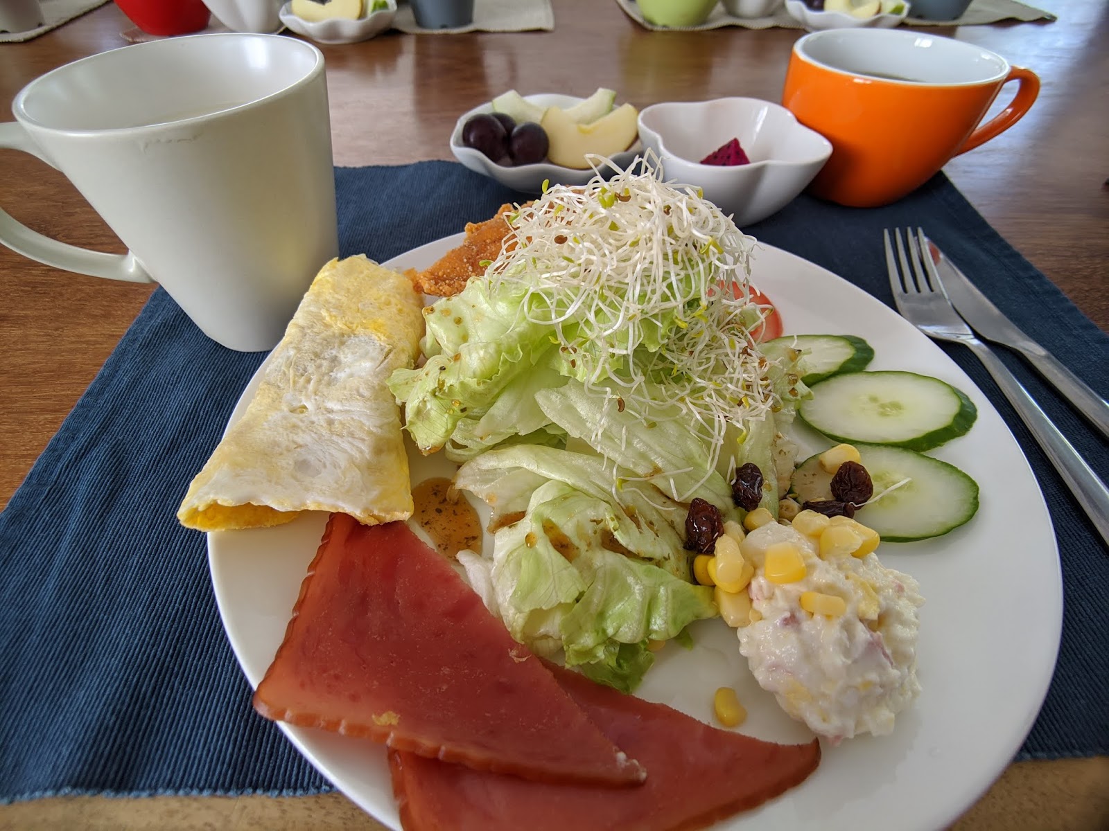 入住時管家會詢問早餐的時段,有9:00和9:30兩個時段可以選,我們選擇了9:00。魔法貓早上8:00就起床了(晚上很早睡,其實已經算睡很久了😀),還好有民宿準備的零食可以先墊墊肚子。早餐有咖啡、豆漿、火腿、煎蛋、炸雞柳條、土司和生菜沙拉以及水果。