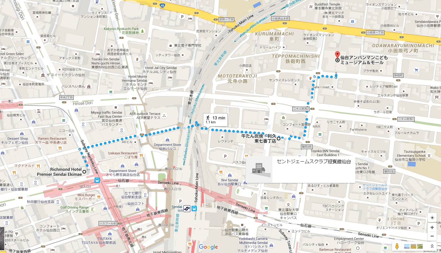 從旅館(Richmond Hotel 仙台駅前)走到麵包超人博物館