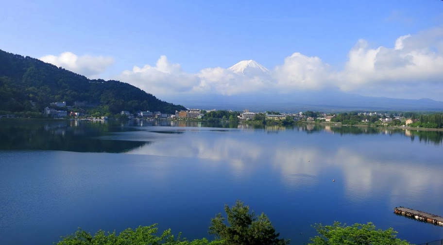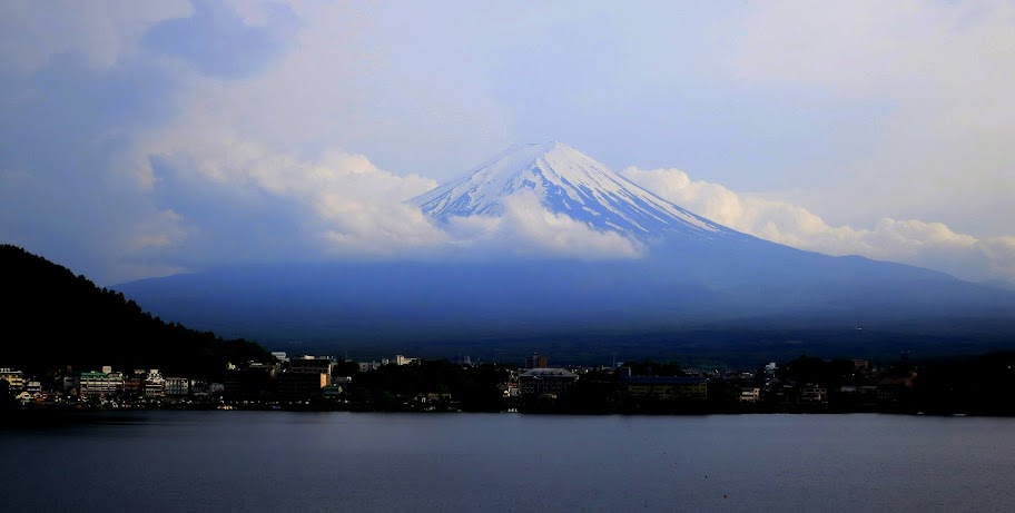 而我們入住的那天下午,窗外的富士山長這樣 (雲多了點),照片經過後製之後勉強還可以接受。:P