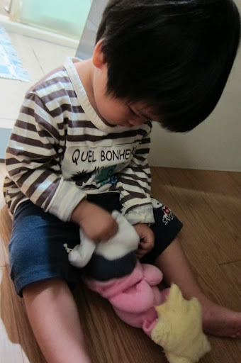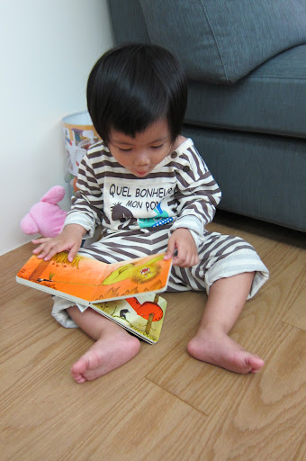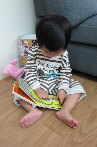 1Y4M3D她很喜歡把這些小書拿出書盒再一本一本裝回去。裝到後面(第五本)的時候困難度變高,要裝很久才會成功。裝不進去的時候還先把裡面的先拿出來再重新裝過 (雖然這個步驟似乎沒有幫助XD),她今天很有耐心不厭其煩的試了好久,最後終於成功了。她很高興地抱著盒子走去書房,把裝好的盒子拿給爸比看。:))