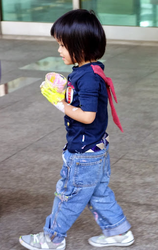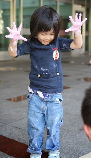 小寶貝怎麼這麼帥氣!本來覺得如果洗不掉的話,衣服褲子變成這樣也蠻好看的。不過很可惜,從洗衣機拿出來之後,證明顏料可以完全洗乾淨 :P
