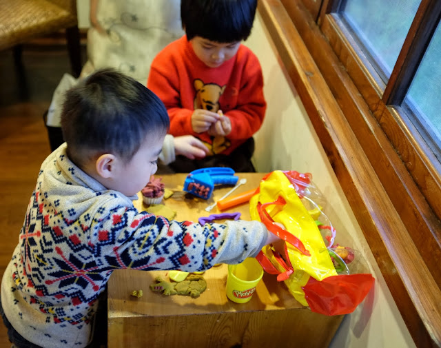 等待吃晚餐的空檔,兩隻小朋友玩起黏土。