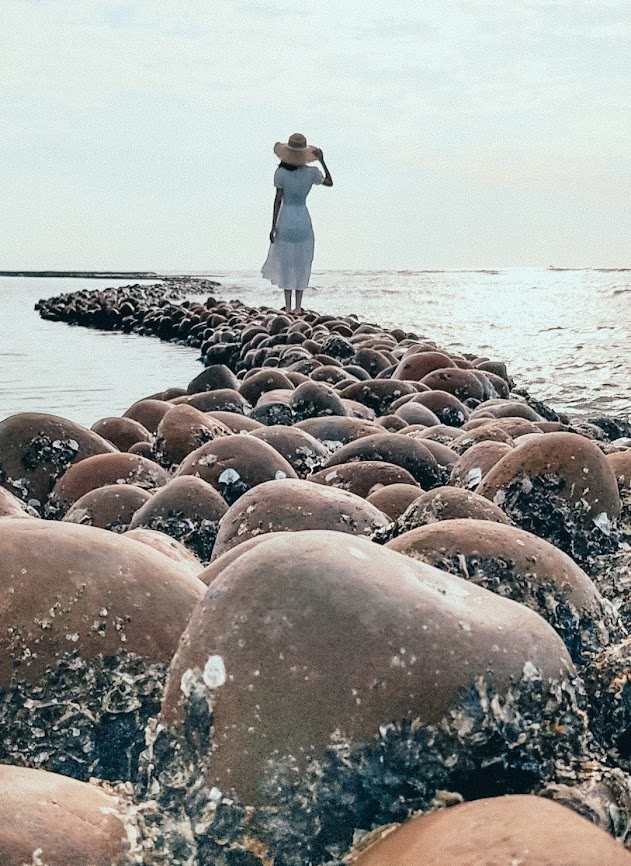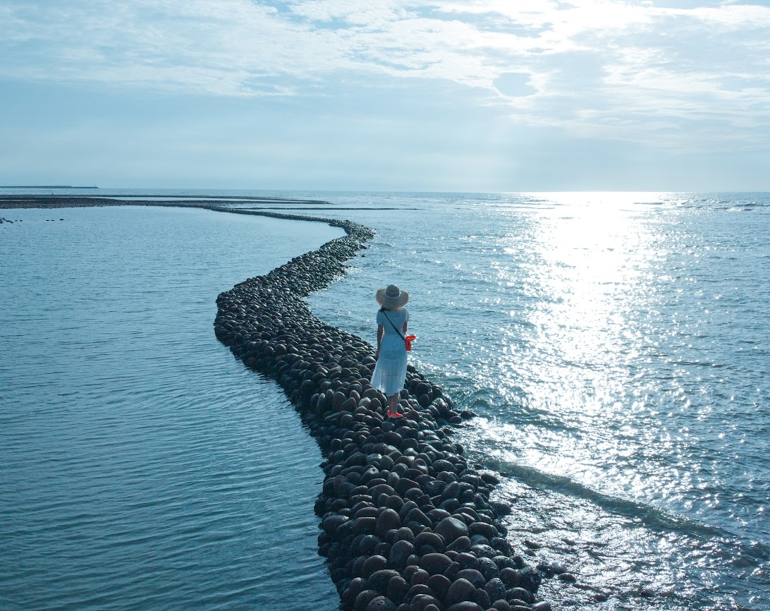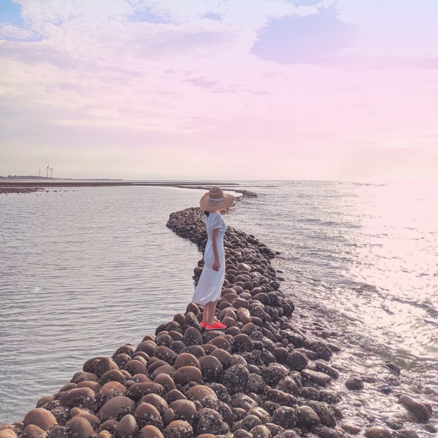 要拍石滬,不能在滿潮的時候,因為完全被海水淹沒了。若是完全乾潮,旁邊的水不夠多,可能也沒辦法拍出站在海中間的一條路的感覺。例如若滿潮時間約是中午12:00,乾潮時間約是傍晚6:00,我們到達的拍攝時間大概在下午4:00左右 (那天是大潮)。大概是要水位介於中間偏低一點點的時候。這樣才有辦法拍到走上石滬,而石滬兩旁都是海水的感覺。記得先看好當天的潮汐表,如果潮汐配合的是夕陽西下的時候就會更完美了 💙🌅💦