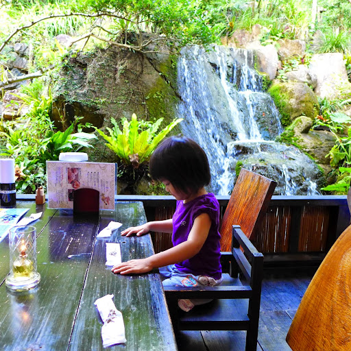 參觀完老屋建築和庭園,來到瀑布旁的餐廳座位。