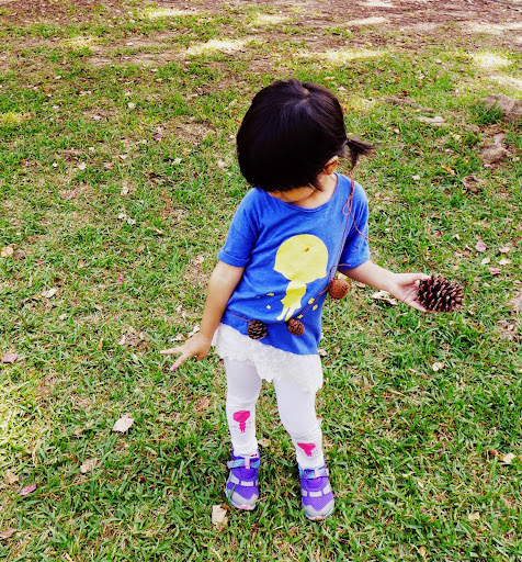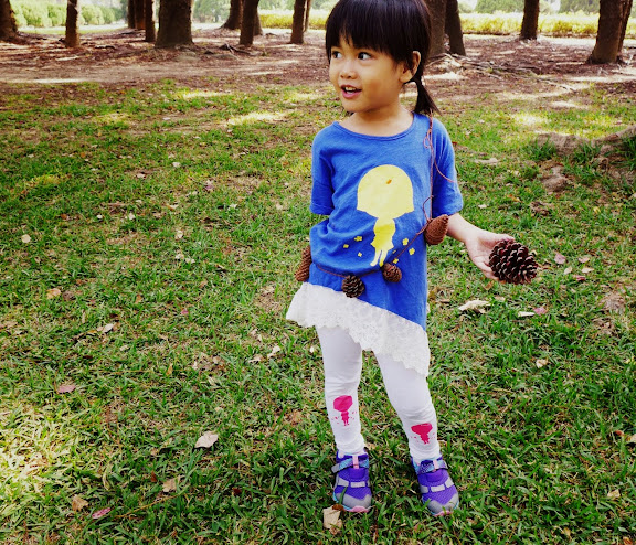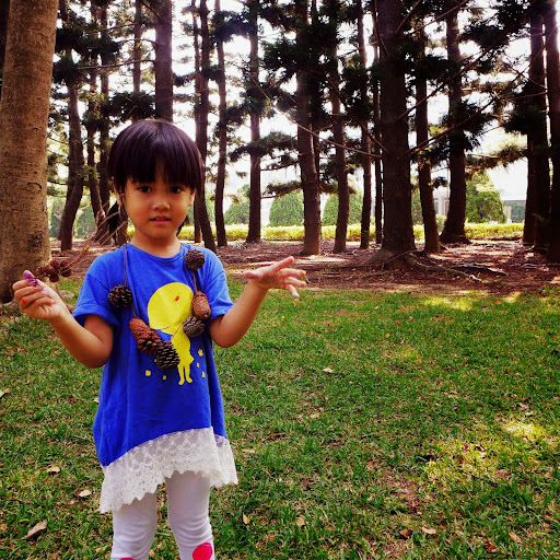 女兒很配合地 戴著松果項鍊走秀一下 😛