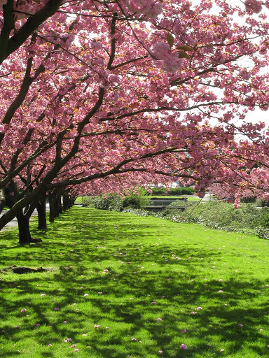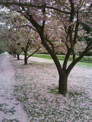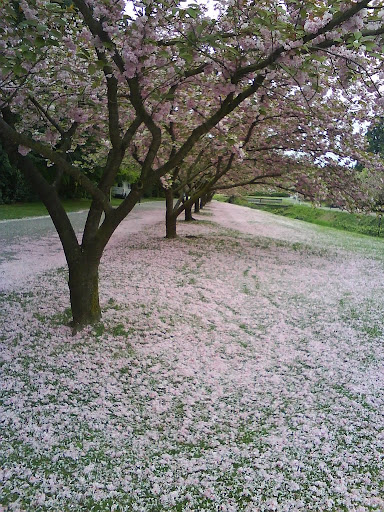 滿開了之後,鮮綠的草地上開始有鮮艷的花瓣點綴。等過了一陣子之後就會變成櫻花地毯了。