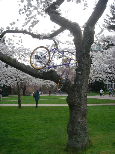 也不知道是誰把腳踏車架到樹上去了。腳踏車上漆的是UW的代表色。紫色和金色。