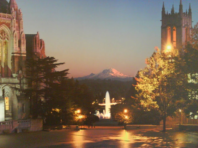 春天的傍晚十分如果條件許可,也是很棒。拍這張照片的那一天,天空非常漂亮,Mt. Rainier也很清楚。 再加上圖書館附近那幾棵緋櫻開花,光線好, 氣氛佳, 整個很夢幻(可惜的就是噴泉沒有在噴水)。