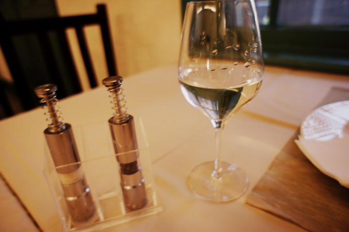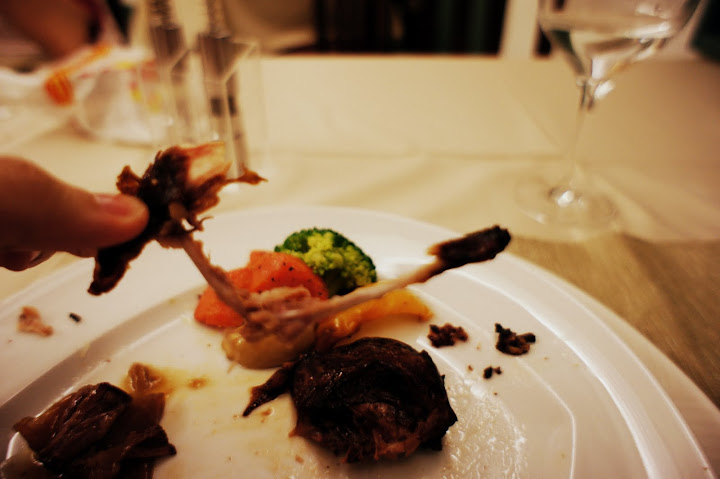 主菜一: 燒烤琵琶鶉 (5顆星)。 怎麼會這樣呢? (沒拍到沒拍到沒拍到沒拍到) 實在是因為主菜一上來,看到這隻令人垂涎的小鳥兒 (感覺好殘忍) 一整個太興奮了,就立刻吃了起來。等到猛然一回神想到還沒拍照的時候,這隻鳥兒就已經變成這樣了 XD。(隔壁桌主菜比我們慢上,真想走過去請他們借我拍一下完整的琵琶鶉 XD) 。 真的很好吃,據某個不具名人士透露,牠比米其林三星的鴿子(!?)還要好吃。 我下次來還要吃這個!