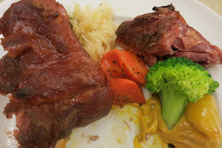 主菜三: 舒菲豬腳 (為什麼豬腳叫舒菲? 原來是舒肥真空低溫烹調法) 。由於另外兩道主菜實在太出色,這道就顯得平凡了,晚餐的時候我還覺得肉的部分太過於鹹了所以不太喜歡。因為太飽了吃不完我們把豬腳打包回去謝宅冰進冰箱裡。沒想到,早上吃了一塊冰過的豬腳當早餐墊墊肚子,竟然又覺得蠻美味的,尤其是皮和膠質的部分。:)