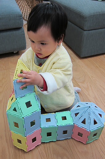 10M20D: 她的小玩具我都玩膩了,所以我決定買我想玩的東西來陪她玩 XD,於是買了積木: 一盒智高,一盒班恩傑尼。這樣至少不用一直陪她玩發條小玩具。給她積木的桶子,她會把積木拿出來看一看在放回去,再換一個拿出來,然後再放回去。