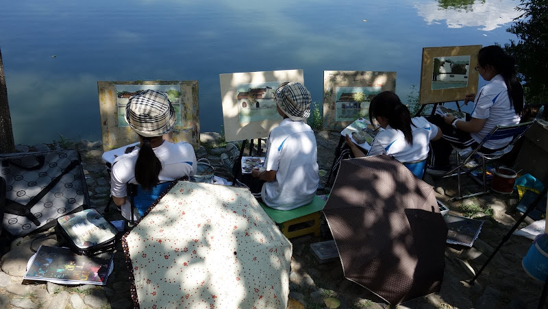 南湖前面有好多學生在寫生。