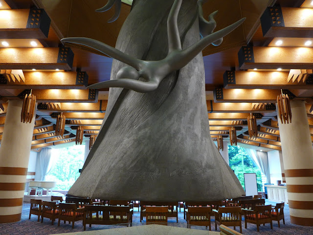 推開旁邊的玻璃門走出去,可以看到這個可愛的雕塑。看這個風格 應該也是岡本太郎的作品吧。好像樹林中的外星人 (原來是河童的形象)。