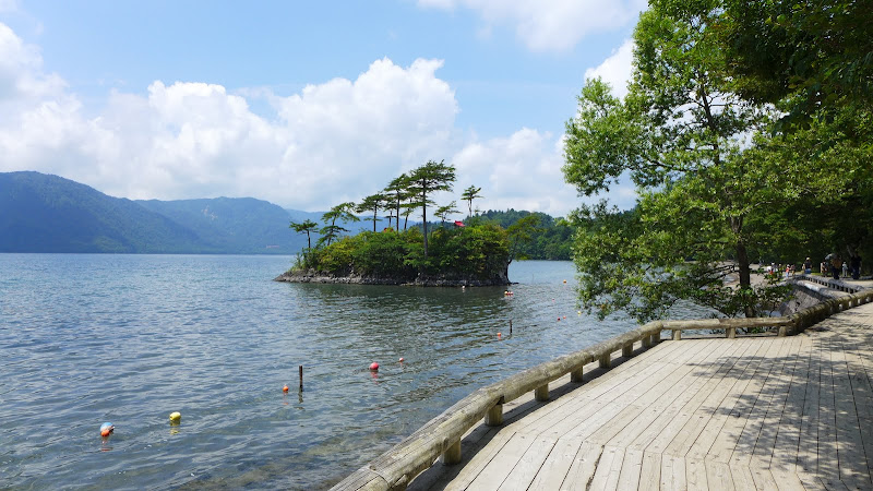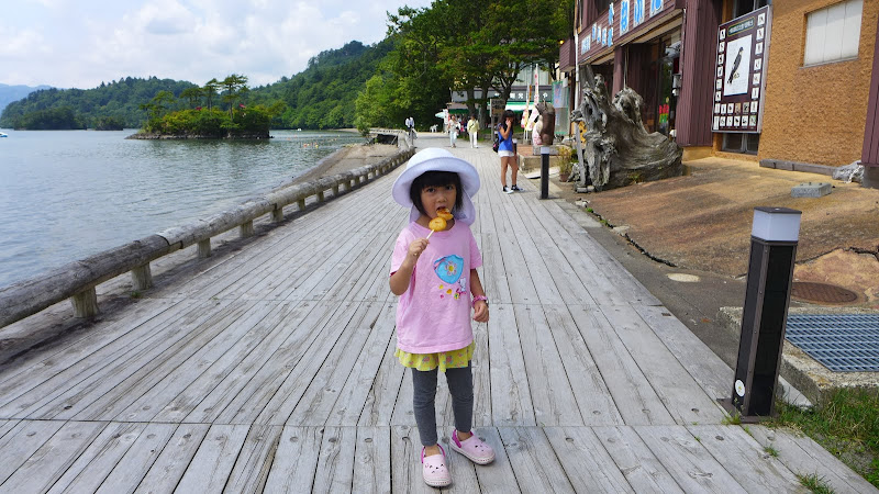 從旅館沿著奧入瀨溪往上游開車到十和田湖。女兒一看到天鵝船就一直說要坐船,我們跟她說:“先去走一圈 ,玩一玩沙子 ,然後再來坐船”。