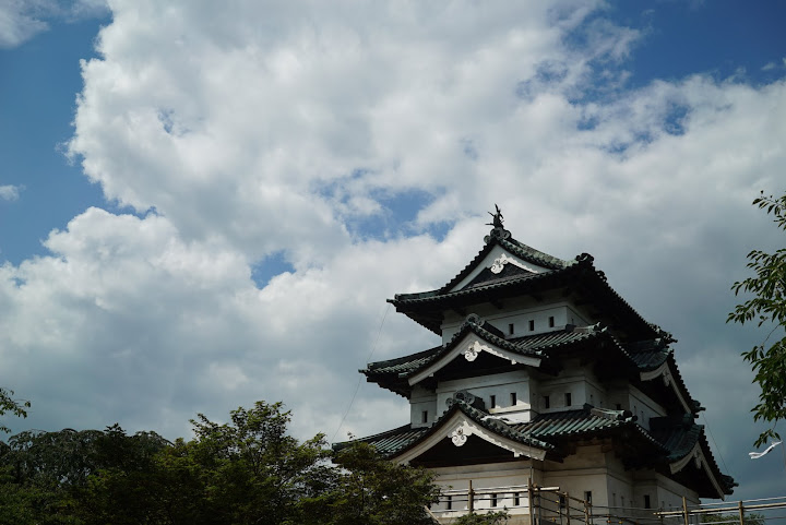 弘前城目前在整修中。因為地基的關係,要把天守閣整個往旁邊移動一段距離。