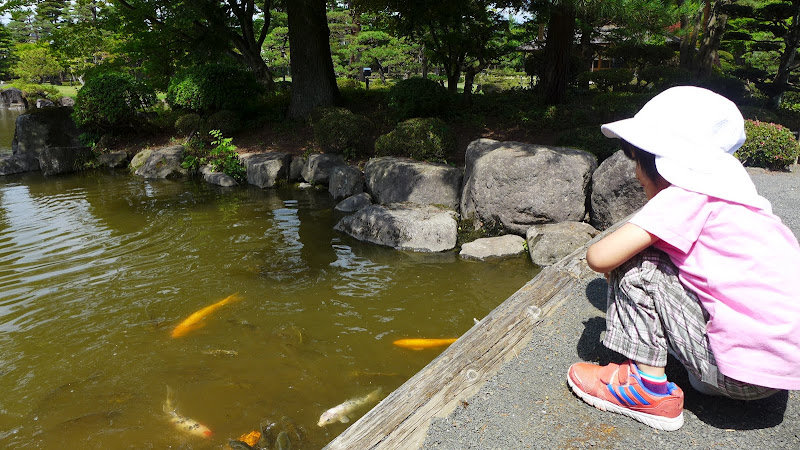 在買票的時候,看見有賣魚飼料,我就很自動的幫女兒買了。女兒看我拿著飼料,就一直問我: “哪裏可以餵魚? 餵魚的地方在哪裡?”。原來沿著石階往下走一段,就可以到達低處的庭園,眼前的水池讓人眼睛一亮。除了很漂亮之外,我知道女兒終於可以開心的餵魚了 XD