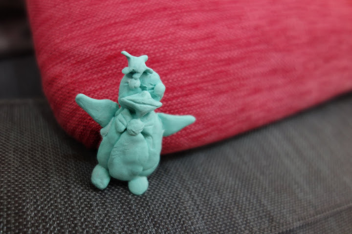 這個月她還有一個新寵,就是玩黏土。一開始會纏著要我做很多東西給她,後來她會開始自己做一些有的沒的,雖然都完全不像,可是她玩得很高興。:)