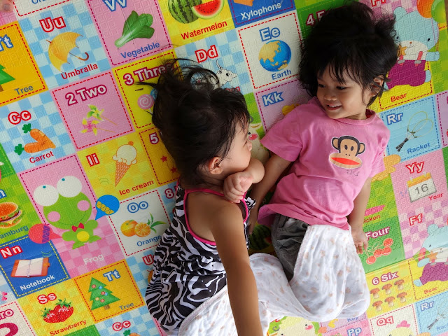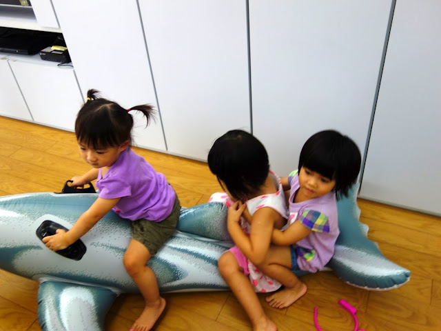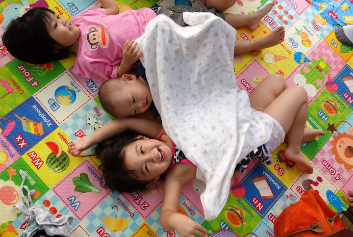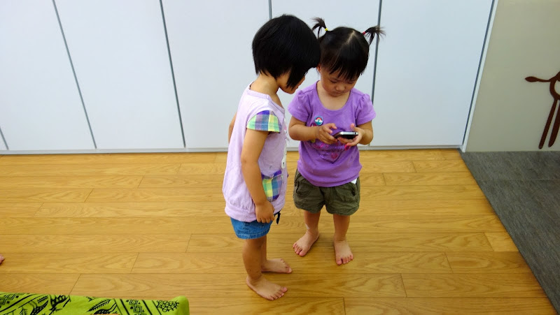 午睡,要媽媽陪睡。午睡起床的時候,跟她一起在床上滾來滾去,她常常會貼近我的臉用水汪汪的大眼睛看我,我說:”我在你的眼睛裡看到我自己耶”,她也說:”我也有看到你的眼睛有我自己耶,有兩個!”:)),覺得好幸福啊。可是晚上,還是只要爸爸陪,或是把爸爸媽媽都拉去一起陪。昨天,爸爸陪睡到一半她又跑出來找我說”三個一起睡”。我說:”一個人陪你,另外一個人要做事”。結果她竟然選了要我陪她。我躺在她旁邊閉著眼睛,她還很溫柔地用手撥我的頭髮,好像我們大人對待睡著嬰兒那樣。可是,盧了快一個小時還沒睡著,我都以為她已經睡著了,她突然又開始講話,等她真的快要睡著的時候,居然跟我說:”我要爸爸陪~~”。看來晚上媽媽陪她還是睡不著啊。T.T