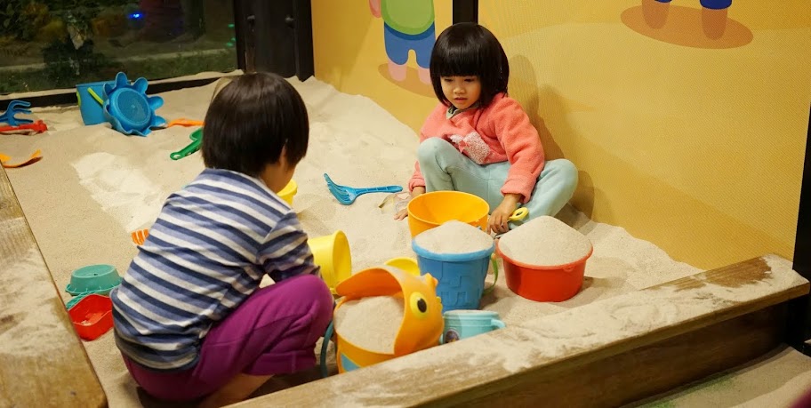 一開始看到恐龍骨頭她很害怕,要爸爸抱著