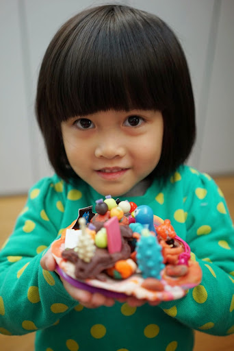 她用黏土和小東西做的蛋糕