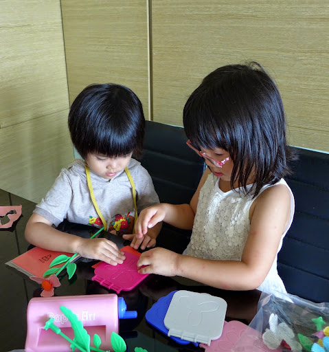 在小兔姐姐家,小兔姊姊很用心地帶女兒做勞作。