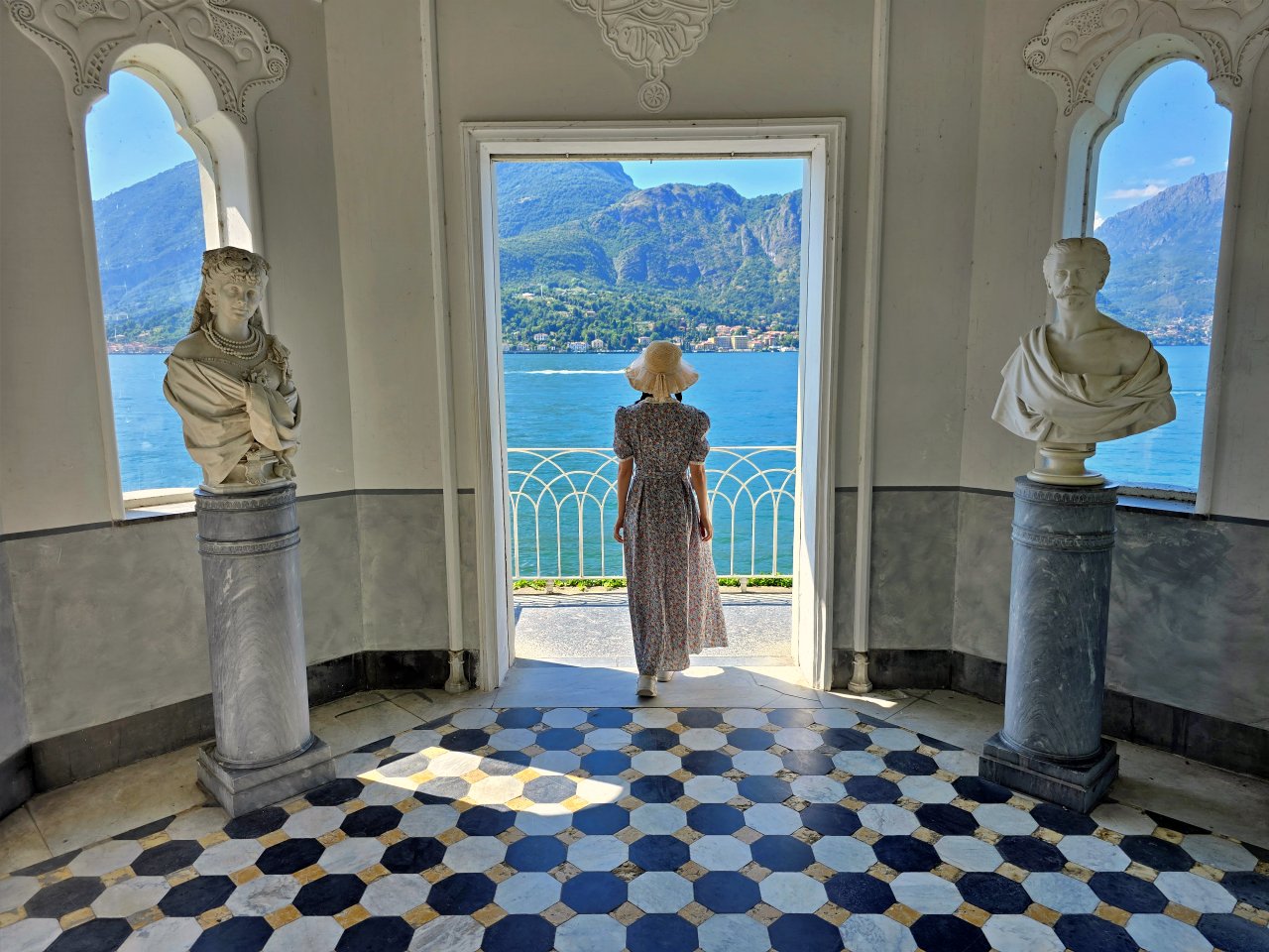 拱形窗與雕花天花板,呈現出濃厚的伊比利亞摩爾風格,線條流暢、細節華美。亭內兩側立有古典胸像,增添了新古典主義的優雅氛圍。黑、白、金三色相間的大理石地板,幾何六角紋路地磚象徵秩序與和諧,是當時貴族莊園設計中的象徵性語彙。正面湖景開口框出科莫湖與對岸群山,猶如一幅天然的風景畫。