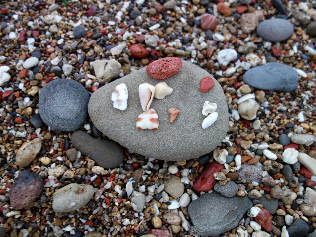 彩色的小貝殼,女兒很開心地撿貝殼,然後丟貝殼到海裡。她走得太靠近海,海浪沖上來,她站不穩跌坐在地上。褲子都濕了,風又很大,趕快把她抱回去洗澡換衣服。