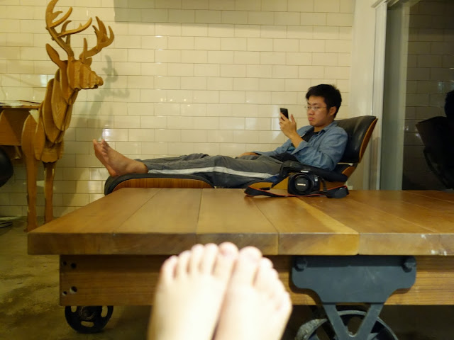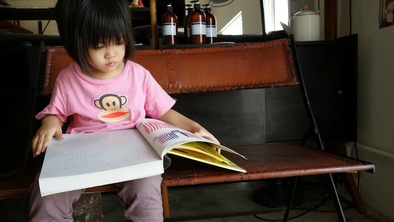 女兒用自己可愛的小腳丫和爸爸合照。我教構圖她自己拿相機按快門。:) 吃完晚餐的悠閒時光。小不點自己搬了一本超厚的書來要我[講故事],可是那是本[設計類]的書籍,真是考驗我說故事的功力啊。:P
