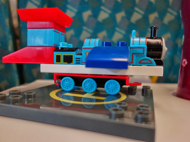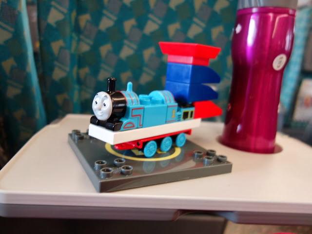 在高鐵上,把女兒用每天集磁鐵的方式,換到的湯瑪士小火車拿出來給她玩。她很快地就變出不一樣的超酷火車!這是有翅膀的火車