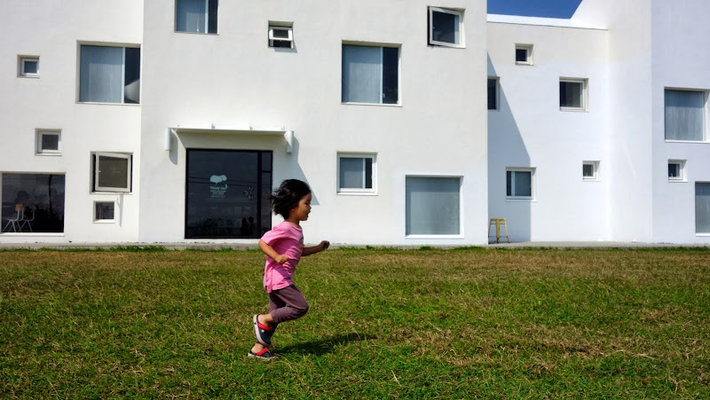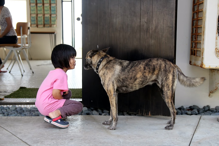 跟狗合照很可愛。可是我看了還是會怕怕捏。女兒這麼靠近狗,老公居然還有閒情逸致拍照。還好這狗應該是民宿養的吧,蠻乖的,我們跟女兒有觀察牠一陣子,但女兒不懂拿捏距離,我還是不放心,把女兒牽走了。