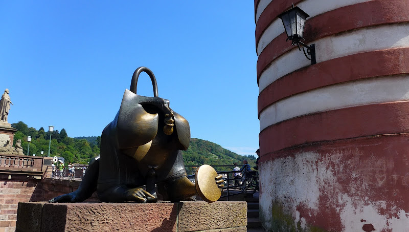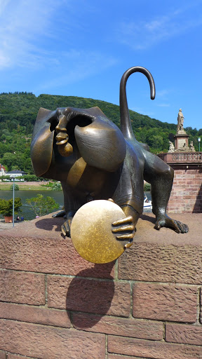 舊橋的猴子銅雕,聽說如果摸猴子的手指,就可以再重返海德堡,摸圓鏡可以招財。(大家把這兩的地方摸的亮亮的 我也去摸了一下:P)猴子銅雕左邊有兩隻小老鼠,碰老鼠的話則是會生小孩(驚)。