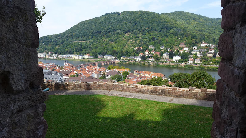 從橋上看山坡上的海德堡城堡 Heidelberg Castle。海德堡的城堡成為廢墟並不是因為戰爭,而是因雷擊導致城堡起火燃燒。第二次世界大戰,德國很多城市都被炸成廢墟,但海德堡卻能毫髮無傷地保留下來。聽說是因為負責進攻海德堡的指揮官,讀過馬克吐溫敘述海德堡的文章,以及聽過海德堡的學生王子的故事,不忍心破壞這座美麗的城市。