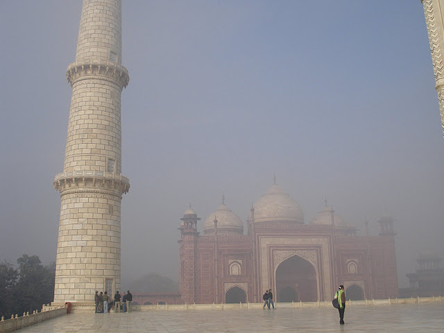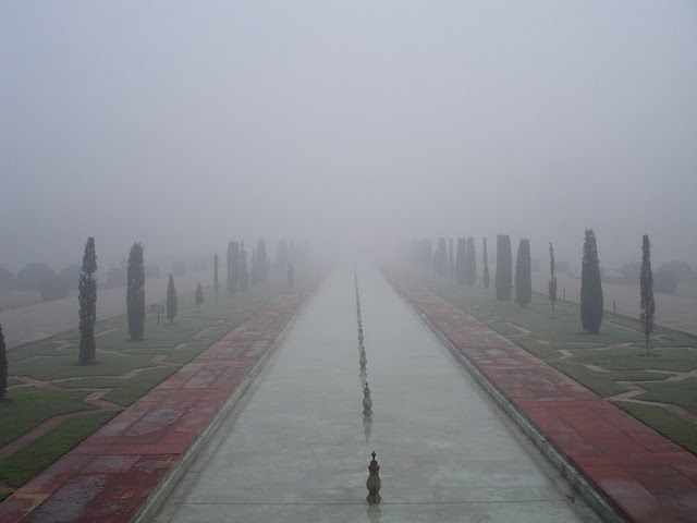 清晨的Taj Mahal, 霧超大,其實正前方就是白色的建築物主體,但是被藏在霧裡,從入口看的時候 什麼都看不到。
