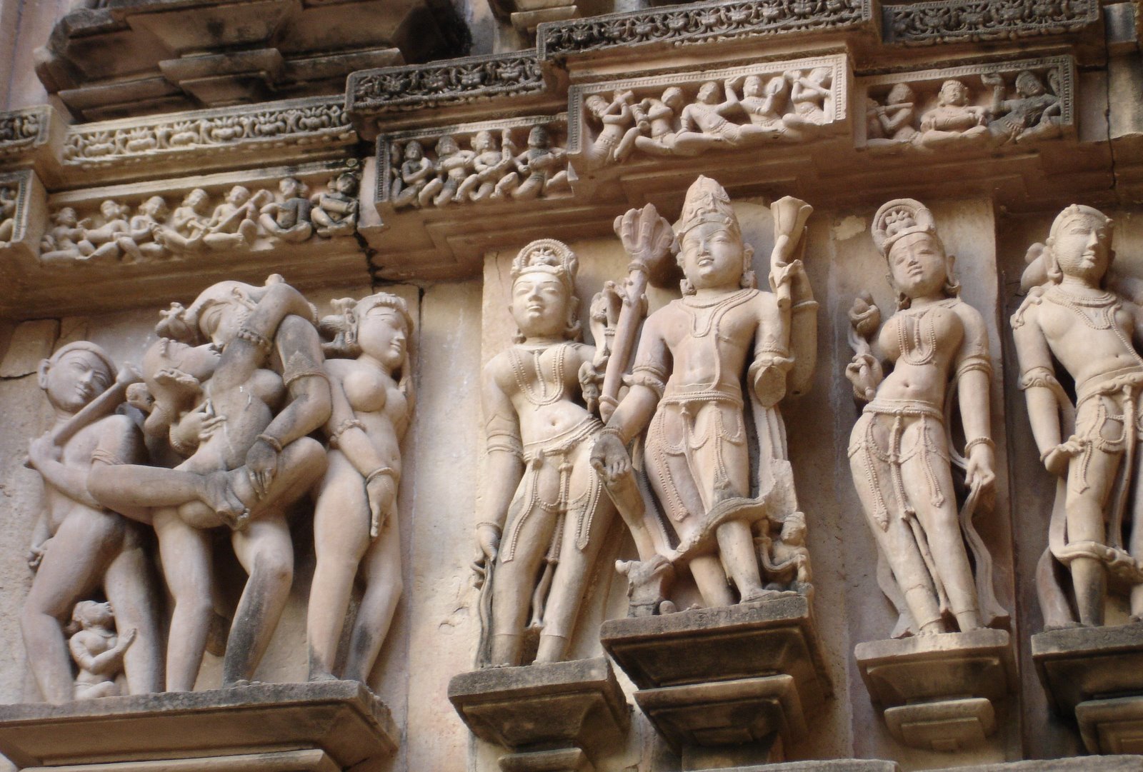 一些有兩層牆壁的寺廟在內壁的外側有小的色情雕刻。 一些學者認為這些是密宗性行為。其他學認為色情藝術是印度教傳統的一部分,將愛欲視為人類生活中必不可少的和適當的部分,其像徵性或明確的展示在印度教寺廟中很常見。扭曲、寬臀和高胸的若蟲在做工精美的外牆板上展示了她們輪廓分明、鑲有寶石的身體。 這些雕像描述了奔跑,化妝、洗頭、遊戲、跳舞,系腰帶、解腰帶。 寺廟中超過 90% 的藝術品都是關於古代印度文化中的日常生活和象徵價值的。