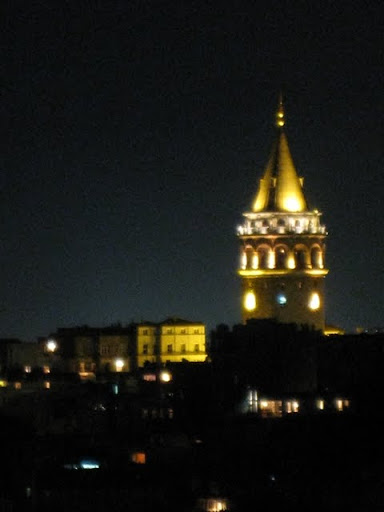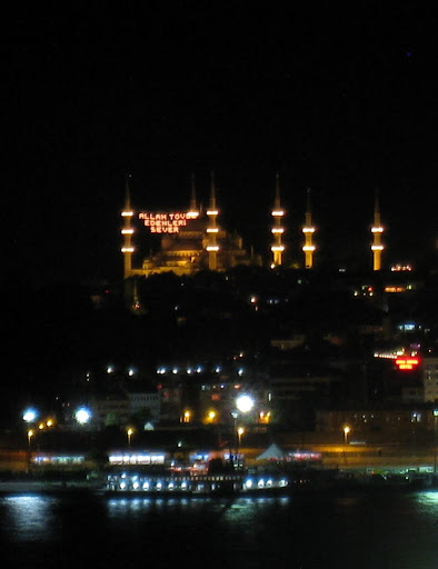 要離開的晚上,依依不捨地在Witt旅館的窗戶旁邊看著夜景,晚上還是可以看到海上亮亮的船開來開去。有亮燈的blue mosque,上面亮亮的字,我用google translate查了,翻成英文是God (Allah) loves those who repent。至於yeni mosque上寫什麼字就看不清楚了。